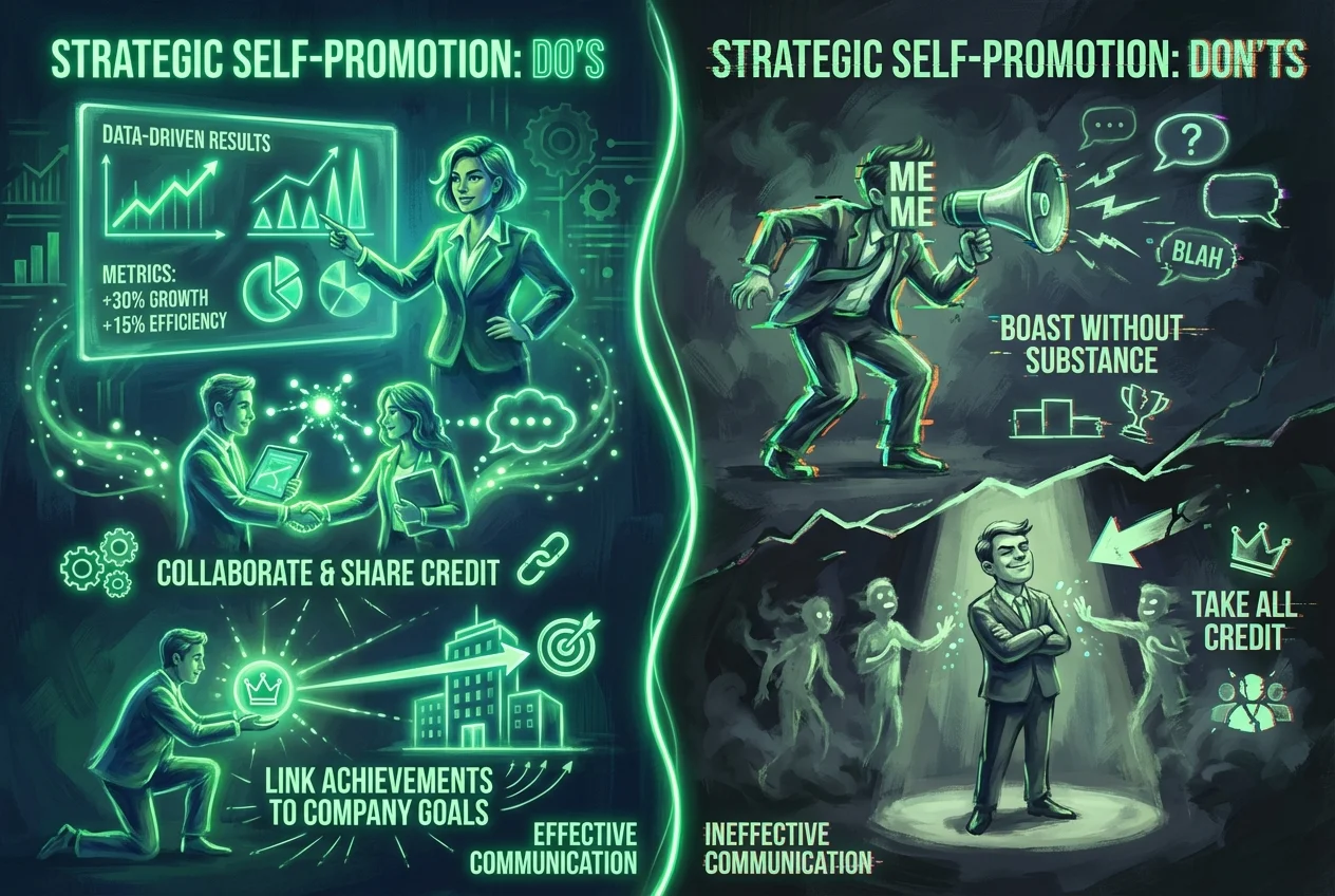 - Søg Feedback og Vis Vækst: Indram din selvpromovering omkring kontinuerlig forbedring. Når du implementerer feedback og opnår bedre resultater, skal du fremhæve den progression. Dette viser en væksttankegang, som er højt værdsat.
